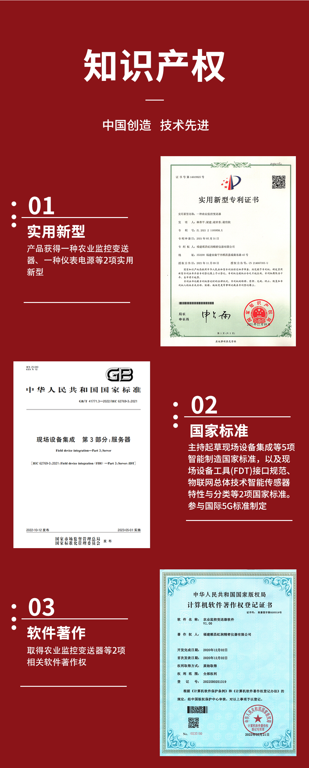 虹潤公司是專業(yè)生產(chǎn)環(huán)境監(jiān)測儀表的國家專精特新“小巨人”企業(yè)。生產(chǎn)的二氧化碳變送器,具有新型紅外檢定技術(shù),自動(dòng)溫度補(bǔ)償,響應(yīng)靈敏,低功耗,模擬量變送輸出或RS485通訊等特點(diǎn)。產(chǎn)品獲得一種農(nóng)業(yè)監(jiān)控變送器、一種儀表電源等2項(xiàng)實(shí)用新型專利,主持起草現(xiàn)場設(shè)備集成等5項(xiàng)智能制造國家標(biāo)準(zhǔn),以及現(xiàn)場設(shè)備工具(FDT)接口規(guī)范、物聯(lián)網(wǎng)總體技術(shù)智能傳感器特性與分類等2項(xiàng)國家標(biāo)準(zhǔn),參與國際5G標(biāo)準(zhǔn)制定,取得農(nóng)業(yè)監(jiān)測變送器等3項(xiàng)相關(guān)軟件著作權(quán)。產(chǎn)品廣泛應(yīng)用于機(jī)房、配電站、地下車庫、工廠倉庫、食品儲(chǔ)存、養(yǎng)殖場、果蔬林園等環(huán)境場合對二氧化碳濃度的檢測。