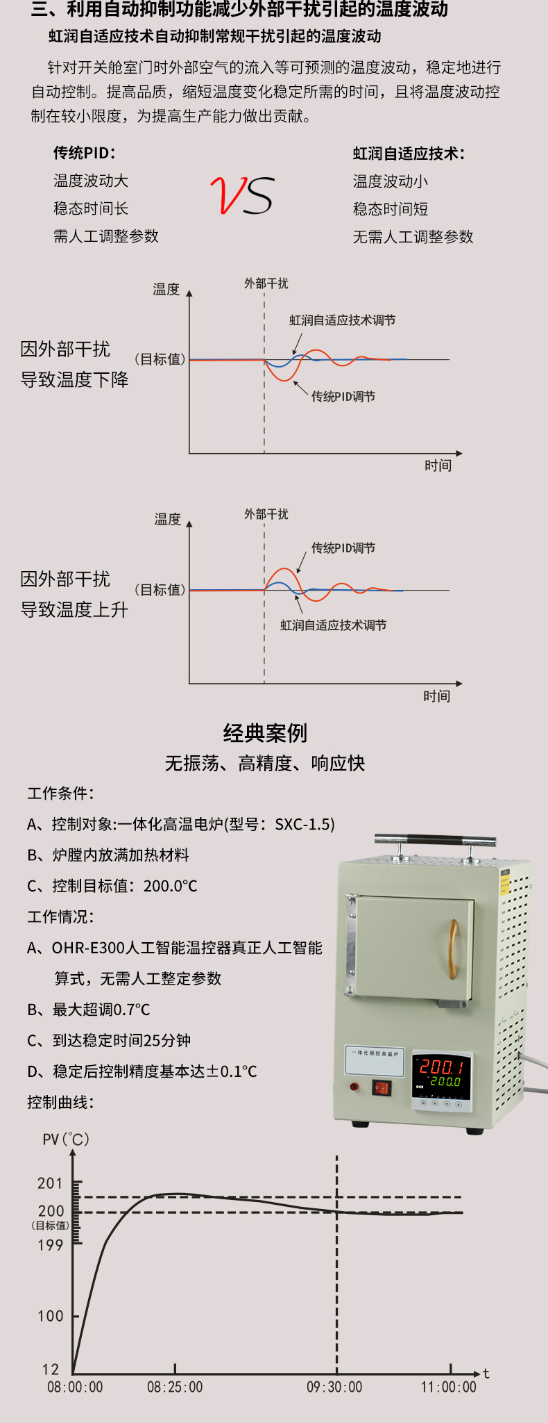 虹潤公司是專業(yè)生產(chǎn)溫控器的國家專精特新“小巨人”企業(yè)。生產(chǎn)的人工智能溫控器,具有真正人工智能算式,無需人工整定參數(shù),控制精度可達±0.1°C,多種輸出類型,高抗干擾等特點。產(chǎn)品獲得模糊PID控制儀及控制方法、人工智能調(diào)節(jié)器、智能化控制器、移相觸發(fā)控制器、閥門自動手動無擾動操作控制方法及裝置等5項國家發(fā)明專利,主持起草工業(yè)過程控制系統(tǒng)用模擬輸入兩位或多位輸出儀表、物聯(lián)網(wǎng)智能溫度儀表通用技術(shù)條件、工業(yè)過程測量和控制系統(tǒng)用智能調(diào)節(jié)器等3項國家標準,以及通信系統(tǒng)多通道數(shù)據(jù)采集控制終端規(guī)范軍用標準,參與國際5G標準制定,取得模糊PID溫控儀等3項相關(guān)軟件著作權(quán)。產(chǎn)品廣泛應用于電力、石化,冶金、制藥、食品等幾乎所有工業(yè)現(xiàn)場,實現(xiàn)精準控溫,保障生產(chǎn)安全與質(zhì)量。